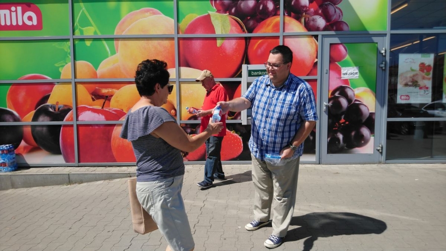 "Przypominamy mieszkańcom Zgierza, że upał może być niebezpieczny, dlatego trzeba pamiętać o kilku podstawowych zasadach, takich jak noszenie nakrycia głowy, możliwie jak najkrótsze przebywanie w pełnym słońcu i oczywiście picie dużej ilości napojów. Właśnie dlatego mamy dziś dla mieszkańców butelki wody, która pomoże przetrwać gorączki" - powiedział Łukasz Kubiak sekretarz SLD w powiecie zgierskim.